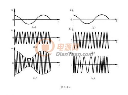 調(diào)幅波的特點(diǎn)是頻率與載波信號的頻率相等,幅度隨輸入信號幅度的變化而變化;調(diào)頻波的特點(diǎn)是幅度與載波信號的幅度相等,頻率隨輸入信號幅度的變化而變化;調(diào)相波的特點(diǎn)是幅度與載波信號的幅度相等,相位隨輸入信號幅度的變化而變化。調(diào)幅波和調(diào)頻波的示意圖如圖8-4-4所示。