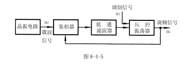 調(diào)頻波的特點(diǎn)是頻率隨調(diào)制信號幅度的變化而變化。由8-4-6式可知,壓控振蕩器的振蕩頻率取決于輸入電壓的幅度。當(dāng)載波信號的頻率與鎖相環(huán)的固有振蕩頻率ω0相等時,壓控振蕩器輸出信號的頻率將保持ω0不變。若壓控振蕩器的輸入信號除了有鎖相環(huán)低通濾波器輸出的信號uc外,還有調(diào)制信號ui,則壓控振蕩器輸出信號的頻率就是以ω0為中心,隨調(diào)制信號幅度的變化而變化的調(diào)頻波信號。由此可得調(diào)頻電路可利用鎖相環(huán)來組成,由鎖相環(huán)組成的調(diào)頻電路組成框圖如圖8-4-5所示。