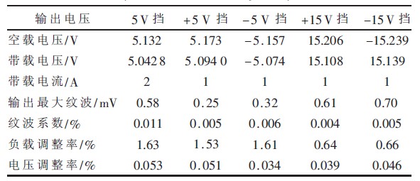 測試儀器采用固緯4 位半數(shù)字萬用表(GDM-8245) 、上海愛儀交流毫伏表(AS2294D) 和調(diào)壓變壓器(TDGC -0.5/0.5) .負載電阻采用水泥電阻(2.5Ω/20 W、5Ω/20 W、15Ω/20 W) .電源性能參數(shù)如表1 所示。可以看出, 負載調(diào)整率和電壓調(diào)整率反映出了電源較高的穩(wěn)定度, 紋波系數(shù)指標反映出低紋波特性。