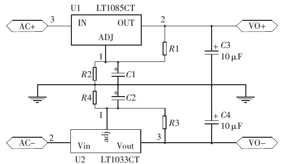 LT1083/LT1033 系列正負可調(diào)穩(wěn)壓器的效率大大高于現(xiàn)有器件,可以提供7.5 A、5 A 和3 A 輸出電流,并能在低至1 V 的壓差條件下運行,壓降在最大電流條件下保證在1.5 V 以內(nèi)。負載電流減小時允許壓差同時減小,可在多種電流水平條件下通過片內(nèi)修整電路,提供所保證的最小壓差,并能夠使輸出電壓準確度調(diào)節(jié)至1%.其電壓調(diào)整率為0.015%,負載調(diào)整率為0.01%,對電流限值也進行了修整,最大限度地減小了過載條件下穩(wěn)壓器和電源電路上承受的應力,具有熱功耗限制保護[10].LT1083/LT1033 系列器件的引腳與老式三端穩(wěn)壓器兼容,與大多數(shù)穩(wěn)壓器設計中的10 μF 輸出電容器以及PNP 穩(wěn)壓器多達10%的輸出電流作為靜態(tài)電流消耗不同,LT1083/LT1033 系列的靜態(tài)電流流入負載, 大大降低了電源功耗。此芯片電壓調(diào)整率小、負載調(diào)整率小的特點能夠保證輸出電壓穩(wěn)定度高。正負線性穩(wěn)壓模塊電路如圖3 所示,其中R1=R3,R2=R4.電路中的電阻參數(shù)可根據(jù)輸出可調(diào)電壓公式確定: