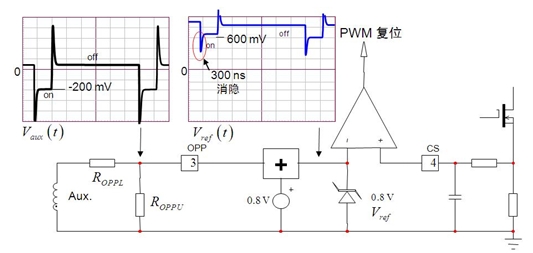 如圖 1 所示,電路中的光耦合器斷路或 TL431 分壓器網絡遭受嚴重漂移影響(或其某個電阻丟失或出現錯誤值)時,輸出電壓就可能超出規(guī)定的限制值,這就是過壓條件。大多數情況下,過壓條件可能對下行負載有害,適配器這時必須完全關斷。NCP1250/1 在 OPP 引腳上也集成了 3 V 參考比較器,這比較器可用于多種功能,如 OVP。如果這 OPP 引腳電壓連續(xù)四次超過 3 V,就使控制器 IC 閂鎖保護。