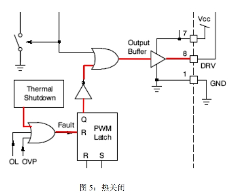 熱關(guān)閉(TSD):過(guò)熱保護(hù)功能有助于實(shí)現(xiàn)良好的電源設(shè)計(jì)。當(dāng)結(jié)點(diǎn)溫度超過(guò)140℃時(shí),該功能激活,驅(qū)動(dòng)器變?yōu)榈碗娖?;結(jié)點(diǎn)溫度降到典型值30℃時(shí)器件恢復(fù)工作。