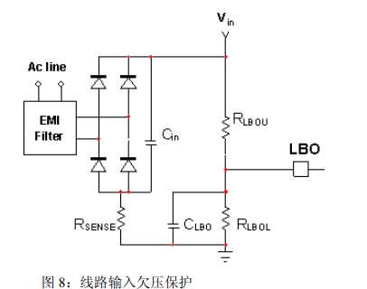 •可調(diào)節(jié)輸入欠壓(BO),F(xiàn)B引腳電壓占Vbulk的一部分,不需要高壓感測(cè)軌,可以省電;