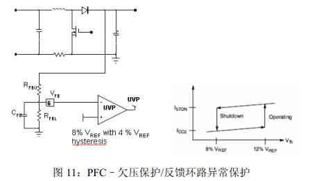 5.欠壓保護(hù)(UVP)/反饋環(huán)路異常保護(hù):UVP可以防止在反饋故障條件下啟動(dòng)。當(dāng)VFB<8%VPREF=0.2V時(shí),UVP激活,器件關(guān)閉;當(dāng)VFB高于12%VPREF=0.3V時(shí),器件自動(dòng)開(kāi)始工作。