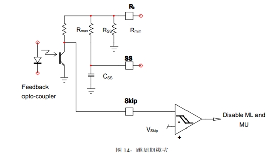 在下列情況時(shí),VLBO可下拉至2V(VLBO(PD)):VLBO高于2V(高線(xiàn)路電壓時(shí)),以及VCTRL處于最大值的時(shí)間長(zhǎng)于4ms(tPFCflag);Vbulk低于額定輸出的95%時(shí)。PFCPowerBoost功能在啟動(dòng)時(shí)被禁止;最長(zhǎng)下拉持續(xù)時(shí)間的典型值為5ms(tLBO(PDlimit));在后續(xù)最少70ms時(shí)間(tLBO(PDblank))內(nèi),開(kāi)關(guān)保持在開(kāi)路狀態(tài)。