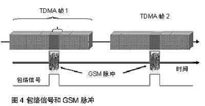 特定的手機(jī)只在屬于它的時間空當(dāng)發(fā)射。包絡(luò)信號的基本頻率是1/4.615 ms=217Hz。諧波頻率為434Hz、651Hz等。如此頻率是聽得到的。如圖4所示,為手機(jī)的包絡(luò)信號。