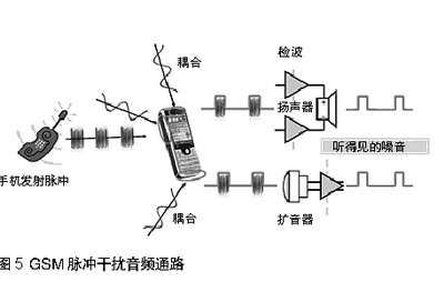當(dāng)手機(jī)與基站通訊,或兩個手機(jī)彼此接近時,發(fā)射脈沖通過擴(kuò)音器,揚(yáng)聲器,或頭戴式耳機(jī)線傳人音頻通路。見圖5。