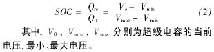 如果僅采用超級電容作為唯一輔助能源還存在諸多不足之處,如:電動汽車長時間停機后再次啟動,由于超級電容的自放電效應,在燃料電池的能量輸出尚未穩(wěn)定時車載輔助系統(tǒng)的供電將無法保障。況且超級電容能量密度很低,若要達到一定的能量儲備能力其設備體積勢必加大。當前超級電容都是與其他動力電池一起購車輔助電源系統(tǒng),在燃料電池汽車上使用的。為了克服精確的描述超級電容的特性,可以采用阻抗法進行建模代替簡單RC回路模型。超級電容當前SOC主要基于超級電容的輸出電壓: