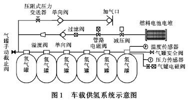 為了保證燃料電池汽車的安全穩(wěn)定運(yùn)行,需要設(shè)計(jì)一套安全有效的供氫系統(tǒng)。在燃料電池汽車上,供氫系統(tǒng)一般包括電磁閥、安全閥、溢流閥、熱熔栓、手動(dòng)截止閥、溫度傳感器和壓力傳感器等在內(nèi)的輔助安全裝置,其示意圖如圖 1 所示[9]。車載供氫系統(tǒng)安全措施應(yīng)從預(yù)防與監(jiān)控兩方面著手。從預(yù)防的角度來說,筆者以國內(nèi)研發(fā)的燃料電池中巴車為例,給出了車載供氫安全實(shí)例。