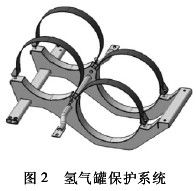 ( 2) 氫氣罐保護(hù)。高壓氫氣罐的固定支架和鋼帶應(yīng)有足夠的強(qiáng)度,以保證在碰撞過程中,高壓氫氣罐的動(dòng)態(tài)位移不會(huì)太大,避免造成連接管路的斷裂、變形和氫氣的大量泄漏。何健[13]基于顯式有限元理論,按照 CMVDR294 法規(guī)對國內(nèi)自主開發(fā)的某燃料電池轎車進(jìn)行正面碰撞分析,對比分析兩種氫氣罐保護(hù)系統(tǒng)設(shè)計(jì)方案的計(jì)算結(jié)果,提出了安全有效的氫氣罐保護(hù)方案,即氫氣罐保護(hù)系統(tǒng)采用整體式設(shè)計(jì)。如圖 2 所示,氫氣罐框架通過 3 根橫梁和 2 根縱梁將兩個(gè)氫氣罐集成到一個(gè)框架總成。縱梁截面為“Π”形,由幾塊板材拼焊而成,中部設(shè)計(jì)出兩個(gè)圓弧形凹槽,可以對氫氣罐進(jìn)行有效的固定和保護(hù)。