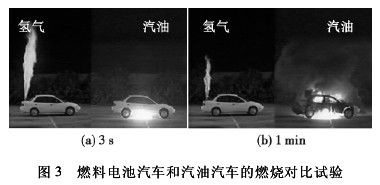 邁阿密大學(xué)的 MICHAEL[15]分別對燃料電池汽車和汽油汽車的燃燒進(jìn)行對比試驗(yàn),將兩輛汽車分別用氫氣和汽油做燃料,然后做泄漏點(diǎn)火試驗(yàn),如圖 3 所示。點(diǎn)火 3 s 后,高壓氫氣產(chǎn)生的火焰直噴上方,而汽油由于比空氣重,則從汽車的下部著火。到 1 min 時(shí),氫氣作燃料的汽車只有漏出的氫氣在燃燒,汽車沒有大問題; 而汽油車則早已成為一個(gè)大火球,完全燒光。這說明氫氣汽車比現(xiàn)在普遍使用的汽油車安全得多。