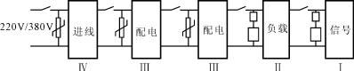從圖1可以看出,在220V/380V線路中的每一區(qū)域,都應(yīng)該在其前面并聯(lián)氧化鋅壓敏電阻器或過電壓保護(hù)器,雷電感應(yīng)過電壓能量將通過逐級(jí)的防雷器件吸收和釋放到大地中,達(dá)到保護(hù)線路和設(shè)備免受雷電破壞的目的;雖然應(yīng)用于Ⅳ、Ⅲ區(qū)域的過電壓保護(hù)器具有自身劣化斷開電源的功能,但考慮到不同的接地狀況,還應(yīng)與過電壓保護(hù)器串聯(lián)合適的熔斷器或空氣開關(guān).