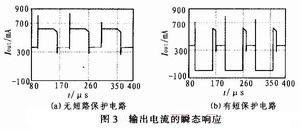 圖3(b)所示曲線的仿真條件與圖3(a)的條件一樣。仿真結(jié)果表明當(dāng)輸出發(fā)生短路時(即負(fù)載為0),輸出電流被限制為O,即功率MOS管被完全關(guān)斷,同時表明系統(tǒng)具有自動恢復(fù)的特點,即負(fù)載短路消除后,系統(tǒng)恢復(fù)正常工作。