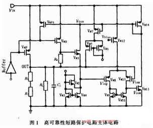 同時當(dāng)短路發(fā)生時(即Vcon信號為低電平),VM7管正常工作,VM5管將導(dǎo)通,有一定的電流流向0UT端;因此一旦短路消除(即0UT端接有負(fù)載電阻),VM5管將對負(fù)載電容和負(fù)載電阻組成的并聯(lián)RC網(wǎng)絡(luò)充電,0UT端電壓升高,Vcon信號將變?yōu)楦唠娖?,電路自動恢?fù)正常狀態(tài)。