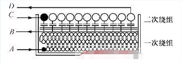 在開關(guān)電源中,輸入整流后的電流為尖脈沖電流,開關(guān)開通和關(guān)斷時變換器中電壓、電流變化率很高,這些波形中含有豐富的高頻諧波。另外,在主開關(guān)管開關(guān)過程和整流二極管反向恢復(fù)過程中,電路的寄生電感、電容會發(fā)生高頻振蕩,以上這些都是電磁干擾的來源。開關(guān)電源中存在大量的分布電容,這些分布電容給電磁干擾的傳遞提供了通路,如圖2所示。圖2中,LISN為線性阻抗穩(wěn)定網(wǎng)絡(luò),用于線路傳導(dǎo)干擾的測量。干擾信號通過導(dǎo)線、寄生電容等傳遞到變換器的輸入、輸出端,形成了傳導(dǎo)干擾。變壓器的各繞組之間也存在著大量的寄生電容,如圖3所示。圖3中,A、B、C、D4點(diǎn)與圖1中標(biāo)識的4點(diǎn)相對應(yīng)。