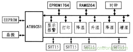 AT89C51和SHT15之間通過串行總線進行通信。執(zhí)行機構主要由電機控制的降溫機、升溫機、降濕機、增濕機等組成。彈藥倉庫的溫/濕度監(jiān)控系統(tǒng)如圖3所示。