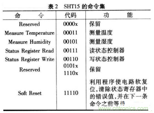 由于SHTl5中含有存儲器,所以設置初始化程序主要是對單片機和SHTl5的存儲器中的一些數據置初值,同時對單片機的初態(tài)進行初始化。該系統(tǒng)是多通道的測量系統(tǒng).SHTl5上電后經過10ms時間就進入休眠狀態(tài),只有當單片機發(fā)出測量命令后,SHTl5才被“喚醒”而進行工作,所以.單片機循環(huán)對各個傳感器發(fā)出溫,濕度測量命令,實現多通道的溫,濕度測量。SHTl5的命令集如表2所列。