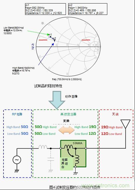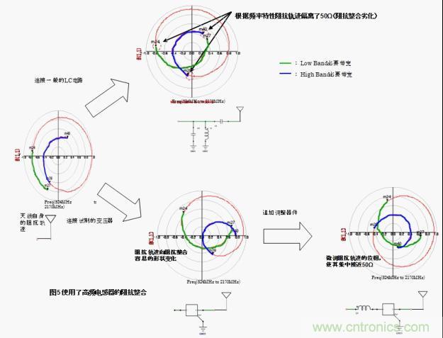 將普通的LC電路跟天線連接,根據(jù)頻率特性的不同在廣帶寬情況下阻抗整合會變得困難。針對該情況,將本次試制的高頻變壓器跟天線連接,low band和high band都轉(zhuǎn)換成了最合適的阻抗。也就是說,工匠圖上的阻抗軌跡有可能變化成阻抗整合容易的形狀。之后通過外部的調(diào)節(jié)元件將阻抗軌跡的相位進行微調(diào),有可能非常容易的就集中在50Ω附近了。(圖5)