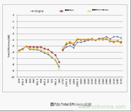 結(jié)果顯示,low band 情況下LC電路和高頻變壓器都不可能達到「S11<-6dB」(反射損耗1.2dB)。而high band情況下,達到「S11<-6dB」范圍的,如果使用LC電路的話是300MHz,而使用高頻變壓器的話則是500MHz,達到了66%的改善效果。(圖6(c)) 。此外,LC電路和高頻變壓器中天線的綜合特性顯示「Total Efficiency」,low band的高頻側(cè)也得到了0.6dB的改善效果。(圖6(d))。這種改善效果正是由于帶寬的廣帶寬化和I.L.得到了改善。
