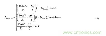 根據(jù)針對(duì)電流限值的相關(guān)閾值設(shè)定分路電阻。例如,方程式2適用于LM5175,并在降壓中指定80mV谷值閾值,在升壓中指定160mV的峰值閾值。當(dāng)升壓占空比在其最大值時(shí),分路功率耗散在最低輸入電壓上達(dá)到峰值。一個(gè)寬縱橫比分路電阻器,比如說封裝規(guī)格為1225的電阻器,有利于將PCB布局布線中的元件放置位置[5]靠近兩個(gè)低側(cè)MOSFET的源極連接。