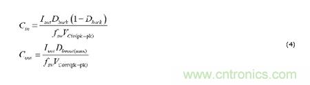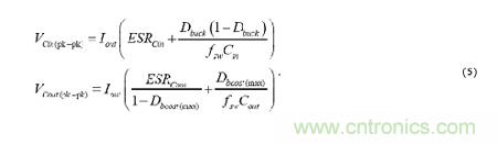 在圖4中,步驟4和5是指分別由降壓和升壓工作模式設(shè)定的輸入和輸出電容值。高密度設(shè)計(jì)越來越多地將數(shù)個(gè)X5R-或X7R-介質(zhì)陶瓷元件組合在一起,有時(shí)還附帶著一個(gè)小尺寸電解電容器來實(shí)現(xiàn)大批量儲(chǔ)能功能。方程式4使用針對(duì)峰值到峰值的紋波電壓,在假定沒有等效串聯(lián)電阻 (ESR) 紋波分量的情況下設(shè)定基線電容估計(jì)值。