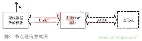在傳感器網(wǎng)絡(luò)中,采用ZigBee通信協(xié)議時,節(jié)點被分為Coordinator、Router以及End Device三種。Coordinator負(fù)責(zé)系統(tǒng)的初始化工作,選擇網(wǎng)絡(luò)的信道等參數(shù)建立網(wǎng)絡(luò),供其他節(jié)點加入;Router負(fù)責(zé)節(jié)點之間命令消息的路由轉(zhuǎn)發(fā)實現(xiàn);End Device負(fù)責(zé)任務(wù)是消息的發(fā)送和接收,只能和父節(jié)點進(jìn)行數(shù)據(jù)通信,不具有路由轉(zhuǎn)發(fā)的功能。在本系統(tǒng)中,Sink節(jié)點主要負(fù)責(zé)監(jiān)控網(wǎng)絡(luò)的建立、上位機命令的分析處理和操作、數(shù)據(jù)的收集等任務(wù),是整個網(wǎng)絡(luò)的數(shù)據(jù)存儲和處理中心,在上位機和監(jiān)控網(wǎng)絡(luò)之間起到橋梁的作用,是系統(tǒng)應(yīng)用中的Coordinator。監(jiān)控網(wǎng)絡(luò)區(qū)域內(nèi)的待定位節(jié)點要具備消息轉(zhuǎn)發(fā)與路由其他節(jié)點的能力,需要可以給所有節(jié)點發(fā)送消息,也可以接收到所有節(jié)點的消息,是系統(tǒng)應(yīng)用中的Router。每個節(jié)點由無線數(shù)據(jù)傳輸模塊和主控DSP模塊組成,同一節(jié)點的兩個模塊之間通過UART總線進(jìn)行通信。節(jié)點之間通過無線RF射頻方式進(jìn)行通信。Sink節(jié)點與上位機使用UART總線進(jìn)行通信,未知節(jié)點的通信方式中并不包含該通信方式。節(jié)點的通信方式如圖3所示。