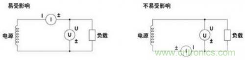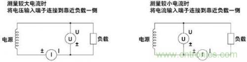 5.降低功率損耗的影響,在測(cè)量大電流情況下,需要將電壓測(cè)量回路接到靠近負(fù)載一側(cè),電流測(cè)量回路測(cè)得的結(jié)果就是流經(jīng)負(fù)載和電壓測(cè)量回路的電流之和,測(cè)量誤差僅是流經(jīng)電壓測(cè)量回路的電流。在測(cè)量小電流情況下,則需要將電流測(cè)量回路接到靠近負(fù)載一側(cè),電壓測(cè)量回路測(cè)得的結(jié)果就是負(fù)載電壓和電流測(cè)量回路的電壓之各,測(cè)量誤差僅是電流測(cè)量回路兩端電壓;如圖6所示。