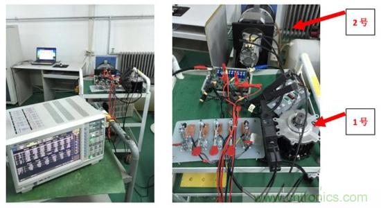 此次測試的對象為小型電機系統(tǒng),系統(tǒng)分為驅動器、電機平臺、測試,3個部分。驅動器輸出通過電纜連接到電機平臺,電機轉軸上安裝扭矩傳感器,傳感器所有連接線引到測試儀器,傳感器輸出信號接入功率分析儀電機測量單元扭矩BNC接口。傳感器輸出100kHz±50kHz脈沖對應0±5Nm扭矩。