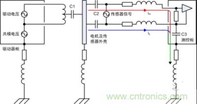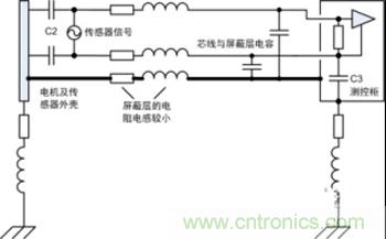 4)此處電機平臺和測控柜已有接地,通過傳感器連接線屏蔽層又將兩者連接,形成地環(huán)路。然而實際工程應用中地環(huán)路往往不可避免地存在,本例中若沒有屏蔽層依然會通過C2、電纜和C3產生高頻地環(huán)路,從這方面看屏蔽層改變了環(huán)路路徑。