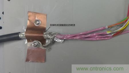 從安全方面考慮,三個機柜都必須接大地,強電線路與信號線分開避免干擾這些都是要遵循的基本原則。實際機柜間位置較遠,接地對于高頻干擾改善不多,只作為安全措施。解決這種問題一般考慮是從干擾源、傳播路徑、敏感設備三方面著手。驅動器和功率分析儀是成型的設備,不便于改動,考慮從傳播路徑入手,使用多芯屏蔽電纜連接扭矩傳感器到測控柜,傳感器端屏蔽層連接到傳感器外殼,也與電機平臺連通,另一側屏蔽層接到測控柜機殼。最初的時候屏蔽層通過一根較長的線連接到測控柜,發(fā)現并沒有改善,最后使用銅片將整根線壓到機柜,干擾得到很大衰減。