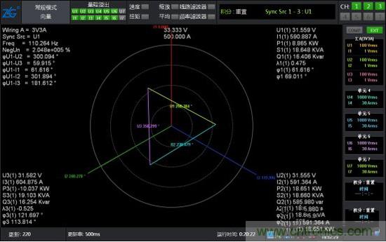 此時將系統(tǒng)運行起來,通過功率分析儀的數據和波形再次進行驗證,電壓波形圖和矢量圖都很完美。
