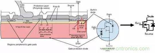 至于為什么不使用耗盡型的MOS管,不建議刨根問(wèn)底。對(duì)于這兩種增強(qiáng)型MOS管,比較常用的是NMOS。原因是導(dǎo)通電阻小且容易制造。所以開(kāi)關(guān)電源和馬達(dá)驅(qū)動(dòng)的應(yīng)用中,一般都用NMOS。下面的介紹中,也多以NMOS為主。在MOS管原理圖上可以看到,漏極和源極之間有一個(gè)寄生二極管。這個(gè)叫體二極管,在驅(qū)動(dòng)感性負(fù)載(如馬達(dá)),這個(gè)二極管很重要。順便說(shuō)一句,體二極 管只在單個(gè)的MOS管中存在,在集成電路芯片內(nèi)部通常是沒(méi)有的。下圖是MOS管的構(gòu)造圖,通常的原理圖中都畫(huà)成右圖所示的樣子。 (柵極保護(hù)用二極管有時(shí)不畫(huà))