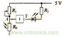 隨著城市化進程的加快發(fā)展,城市建設(shè)也趨于現(xiàn)代化、人文化、科技化,城市道路兩旁的路燈也成了一座城市獨特的風(fēng)景線,其自動控制不但節(jié)省人力,還節(jié)約了能源。如圖所示是自動控制路燈的邏輯電路原理圖,其中R0是光敏電阻,光越強烈,光敏電阻R0的阻值越小,R1與R0串聯(lián)時所分的電壓就越小,A點輸入低電位,通過非門后,輸出端Y為高電位,所以路燈自動熄滅。光越微弱,光敏電阻R0的阻值越小,R1與R0串聯(lián)時所分的電壓就越大,A點輸入高電位,通過非門后,輸出端Y為低電位,所以路燈自動接通。