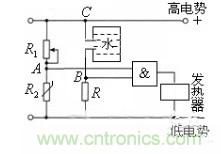 許多家庭都安裝了電熱水器,它給人們的生活帶來了方便。如圖所示是電熱水器系統(tǒng)的恒溫器集成電路。R1為調(diào)溫電阻,R2為熱敏電阻。“與”門電路的兩個輸入端分別接上一個水位傳感器和一個水溫傳感器。當(dāng)水箱充滿水時,B點為高電壓(即輸入為邏輯1),R2為熱敏電阻,溫度越低,熱敏電阻的阻值越大,兩端的分壓越大,當(dāng)電壓達到一定程度時,A點為高電壓(即輸入為邏輯1),當(dāng)A和B都為高電壓時,“與”門的輸出端為高電壓,電熱水器的加熱開關(guān)才會接通電源,對水箱中的水進行加熱。當(dāng)溫度高于一定溫度時,R2的電阻變小,R2兩端的電壓變小,發(fā)熱器停止加熱,所以熱水器處于保溫狀態(tài)。當(dāng)水箱水不滿時,或者溫度高時發(fā)熱器都不會加熱。