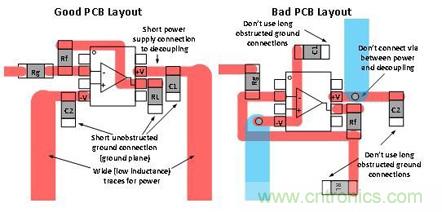 圖 3 將良好的去耦合板面布局與糟糕的布局進行了對比。您應(yīng)始終嘗試著讓去耦合連接保持較短的距離,同時避免在去耦合路徑中出現(xiàn)通孔,原因是通孔會增加電感。大部分產(chǎn)品說明書都會給出去耦合電容器的推薦值。如果沒有給出,則可以使用 0.1uF。