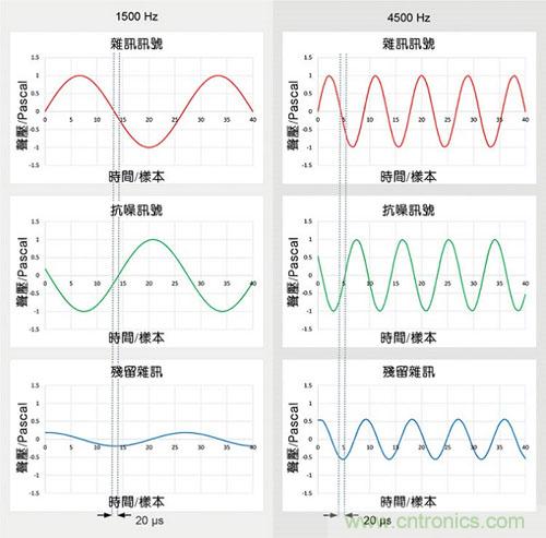 前饋降噪帶寬,在低頻處被耳機(jī)驅(qū)動(dòng)模塊限制在50Hz左右,在高頻處被聲學(xué)結(jié)構(gòu)和訊號(hào)處理延遲限制于3kHz。延遲會(huì)導(dǎo)致難以在抗噪訊號(hào)和噪聲訊號(hào)之間實(shí)現(xiàn)180度的相位反轉(zhuǎn),高頻部份因?yàn)椴ㄩL(zhǎng)較短更難處理。圖2顯示了兩種頻率下20μs延遲對(duì)降噪效果的影響:頻率為1500Hz時(shí),殘余噪聲約剩1/5(14dB ANC),但頻率為4500Hz時(shí),即使延遲不變,殘余噪聲也已增加到3/5(僅4dB ANC)。