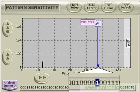 在客戶進行誤碼測試的時候,由于鏈路的損耗和芯片的輸出特性,導致出現(xiàn)了誤碼,但客戶卻想知道究竟是哪一個bit位出現(xiàn)了誤碼,以定位誤碼出現(xiàn)的根源。設置Bert的輸出/輸入端設置為PRBS7的碼型,在誤碼分析功能里面選擇Patten Sensitivity,則可以直接觀察PRBS7的127個比特的每一位所出現(xiàn)誤碼的個數(shù),看最多誤碼所對應的比特位的前后特性,如下圖十三,移動光標到任意一個比特上面,可以看到連續(xù)多個0而中間有一個1跳變的bit即127比特的第94比特出現(xiàn)誤碼的個數(shù)最多,達到5043598個誤碼。從而判斷由于鏈路ISI的影響導致突然的跳變位出現(xiàn)較高的誤碼率。