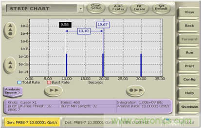 由于客戶的系統(tǒng)要進行長時間的(-20到+80度下)的高低溫老化測試,客戶要看誤碼的性能和溫度變化的相關性,一般的誤碼儀只能統(tǒng)計溫度變化過程中誤碼的總的個數(shù)和誤碼率,而無法得知在整個十幾個小時里面任一時刻誤碼率的變化。而BSX系列誤碼儀則可以使用Strip chart的記錄功能將整個過程中記錄下來,后面可以根據(jù)需要查詢任意時刻的誤碼率變化情況。如下圖,在第10/20/30秒的時間點出現(xiàn)了一些突發(fā)的誤碼,這個如果僅僅是通過簡單的誤碼統(tǒng)計是無法看到時間相關的細節(jié)的,而且其累積記錄時間可以長達幾十小時甚至幾天。