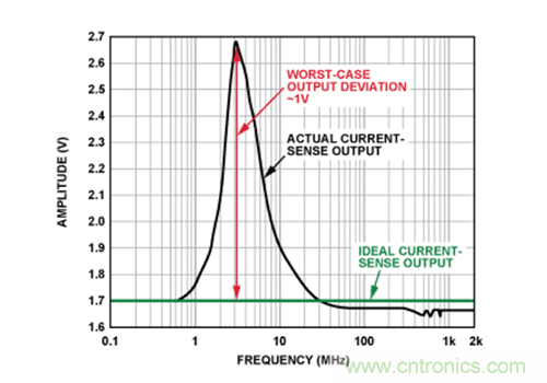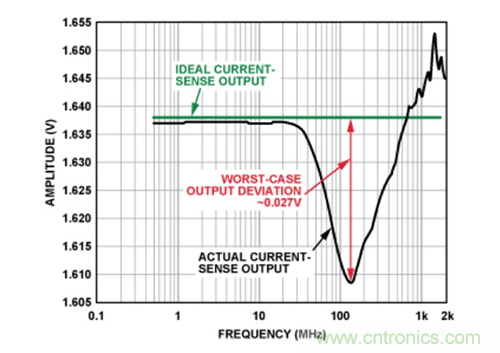 這種情況下,40 MHz時誤差僅為3 mV左右,且峰值誤差(大于100 MHz時)小于30 mV,性能提高35倍。這點(diǎn)清楚地表明,內(nèi)置EMI濾波電路有助于顯著提高電流傳感器防護(hù)性能,使其免受輸入端存在的高頻信號影響。在實(shí)際應(yīng)用中,盡管并不清楚EMI的嚴(yán)重程度,但是如果使用內(nèi)置EMI濾波功能的電流傳感器,實(shí)際上控制環(huán)路將會保持在其容差范圍內(nèi)。
