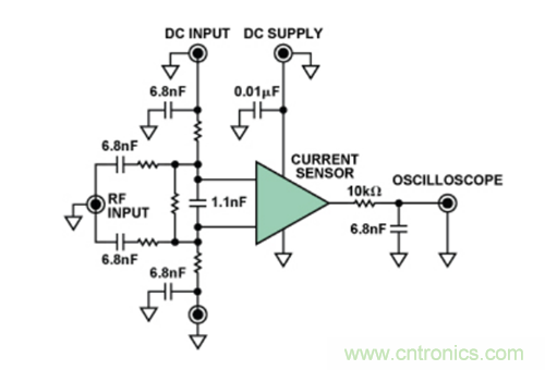 具體而言,這些測試都采用 “直接功率注入法”完成,這是一種通過電容將RF信號耦合至特定器件引腳的方法。根據(jù)待測IC的類型,針對不同的RF信號功率水平和頻率范圍,測試器件的每路輸入。圖4顯示了在特定引腳上執(zhí)行直接功率注入測試的原理示意圖。