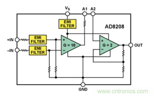 AD8208具有出色的交流和直流性能,且通過相關(guān)認(rèn)證,適合要求采用穩(wěn)定可靠的精密器件來改善系統(tǒng)控制的汽車應(yīng)用。失調(diào)和增益漂移典型值分別小于5 µV/°C和10 ppm/°C。該器件提供SOIC和MSOP兩種封裝,在DC至10 kHz范圍內(nèi)共模抑制比(CMR)最小值為80 dB。