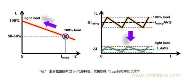 從中可知,要顯著提高其綜合效率,就必須最大限度地控制好較輕負(fù)荷時(shí)的功率損耗。利用混合磁路中不同磁材的特性,通過對(duì)其磁路長度、磁阻及繞線匝數(shù)等影響電感特性的諸要素進(jìn)行優(yōu)化調(diào)節(jié),使之符合圖7所示的L-I直流電感偏置特性,從而可實(shí)現(xiàn)歐效改善與低成本設(shè)計(jì)的兼顧。
