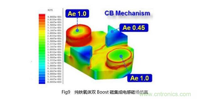對(duì)于這種新型高效電感的設(shè)計(jì),和Boost電感設(shè)計(jì)要求一樣,要求該電感在大紋波電流工作時(shí),保持極佳的效率。由于其電感量可以設(shè)計(jì)成比較小的感值,即使要求直流內(nèi)阻較低,用銅量也能得到大幅的控制。對(duì)于磁性材料中的ΔB磁場變化率大的問題,同樣地采用Hybrid Magnetics技術(shù),可以控制磁性的損耗、減少漏磁的存在,達(dá)到很少的用銅量也能保持很低的內(nèi)阻的目的。