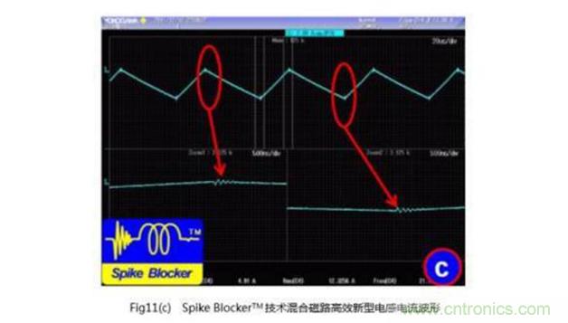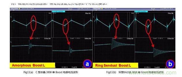 圖11(a)為目前廣為采用的C型非晶材料繞制的3 kW單Boost電感的額定功率時(shí)的典型工作電流波形。在Boost開通和關(guān)斷時(shí),電感電流出現(xiàn)了比較嚴(yán)重的高頻振蕩,其振蕩頻率成分也比較豐富,約在20~30 MHz寬帶上;Fig11(b)為采用數(shù)只φ47的鐵硅鋁磁環(huán)繞制的3 kW單Boost電感的波形,同樣圖中顯示出10 MHz左右的高頻衰減振蕩;Fig11(C)則為采用了優(yōu)化結(jié)構(gòu)和相關(guān)設(shè)計(jì)工藝規(guī)范的Spike Blocker TM技術(shù)后,使用Hybrid Magnetics混合磁路設(shè)計(jì)的新型高效能電感的實(shí)測波形(這些測試均基于相同設(shè)備、相同輸入輸出電壓、功率、工作頻率條件),由此可見,關(guān)注電感的EMC設(shè)計(jì)工藝規(guī)范具有十分重要的意義。