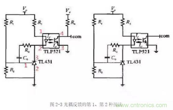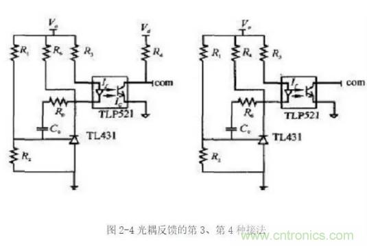 圖2-3所示接法的工作原理是:當(dāng)輸出電壓升高時(shí),原邊電流If增大,輸出電流Ic增大,由于Ic已經(jīng)超過了電壓誤差放大器的電流輸出能力,com腳電壓下降,占空比減小,輸出電壓減?。环粗?,當(dāng)輸出電壓下降時(shí),調(diào)節(jié)過程類似。