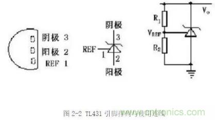 TL431是由德州儀器生產(chǎn)的可控精密穩(wěn)壓源,實(shí)物如圖2-3所示。它的輸出電壓用兩個(gè)電阻就可以任意的設(shè)置到從2.5V到36V范圍內(nèi)的任何值。該器件的典型動(dòng)態(tài)阻抗為0.2Ω,在很多應(yīng)用中用它代替穩(wěn)壓二極管,例如,數(shù)字電壓表,運(yùn)放電路,可調(diào)壓電源,開關(guān)電源等。圖2-2所示為TL431引腳排列與使用連線圖。