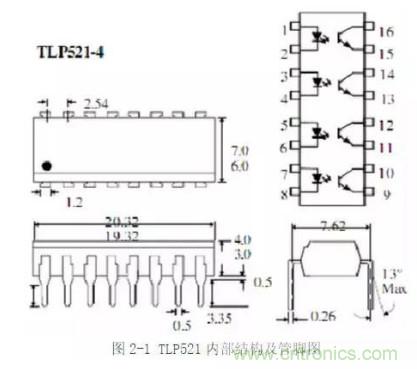 常用于反饋的光耦型號(hào)有TLP521、PC817等。這里以TLP521為例,介紹這類光耦的特性。圖2-1所示為光耦內(nèi)部結(jié)構(gòu)圖以及引腳圖。