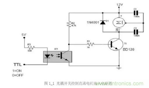 光耦(opticalcoupler)亦稱光電隔離器、光耦合器或光電耦合器。它是以光為媒介來傳輸電信號(hào)的器件,通常把發(fā)光器(紅外線發(fā)光二極管LED)與受光器(光敏半導(dǎo)體管)封裝在同一管殼內(nèi)。當(dāng)輸入端加電信號(hào)時(shí)發(fā)光二極管發(fā)出光線,光敏三極管接受光線之后就產(chǎn)生光電流,從輸出端流出,從而實(shí)現(xiàn)了“電—光—電”轉(zhuǎn)換。典型應(yīng)用電路如下圖1-1所示。