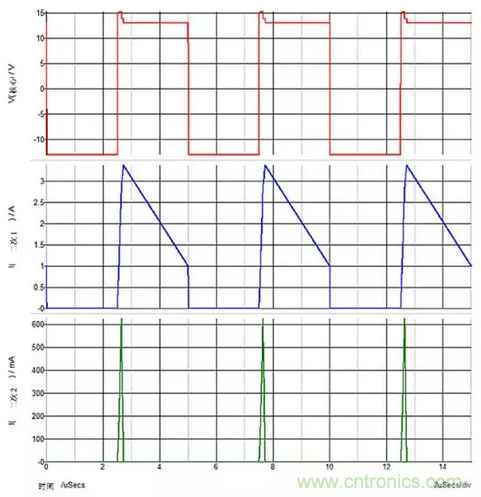 圖3:重載次級1和輕載次級2?;妷簩Υ渭?的輸出電容器進行峰值充電。