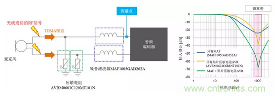 TDK開發(fā)了音頻線用噪音濾波器MAF系列作為抑制此類問題的元件。通過將MAF系列用于麥克風線中,能夠在不降低音頻質(zhì)量的情況下抑制TDMA噪音。